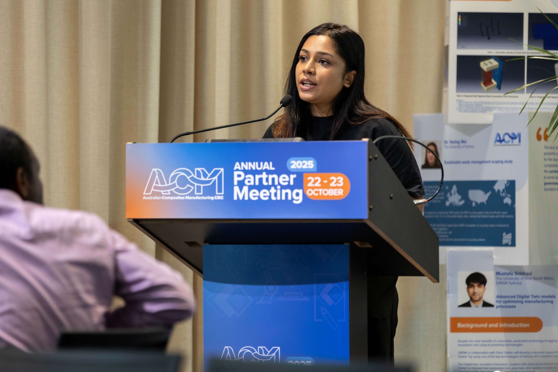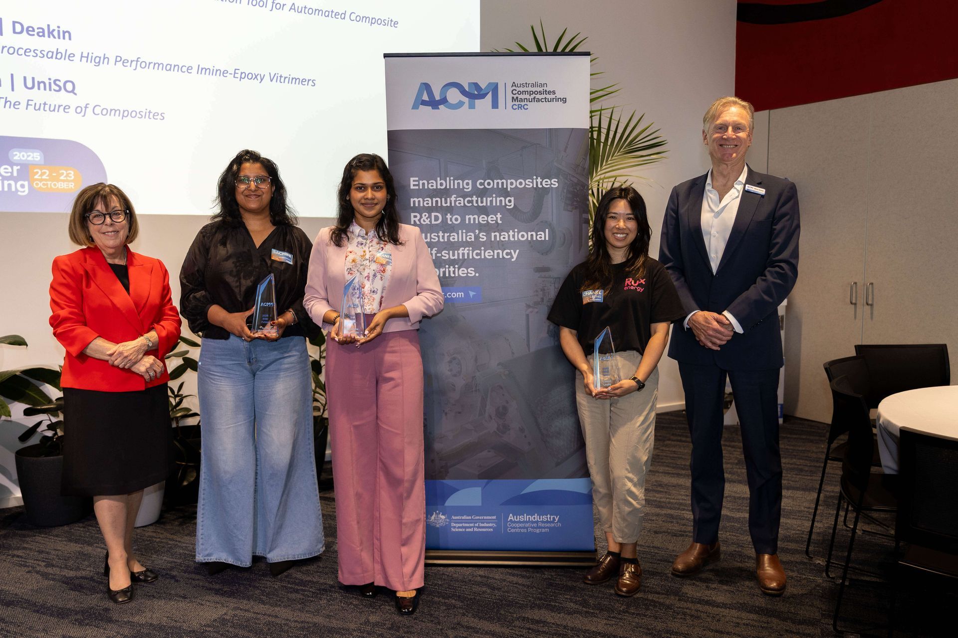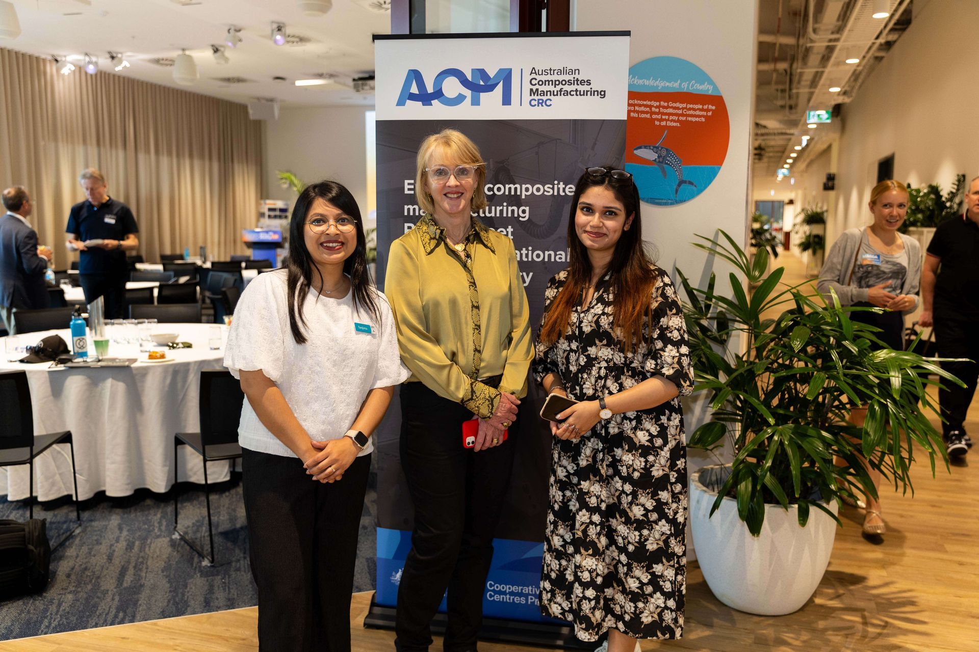 A highlight of the Partner Meeting was when ACM CRC Chair, Dr Abby Bloom, presented the 2025 RISE Fellowships to three exceptional women in STEM. Chanel Leong (Rux Energy), Manesha Fernando (Deakin University) and Sachini Wickramasinghe (University of Southern Queensland) were all very deserving awardees of the Fellowship, which will help progress their important work, and see them continuing to help shape the future of Australia’s composites manufacturing industry.